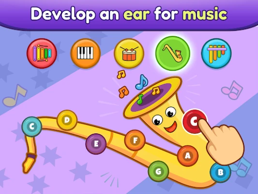 এই অ্যাপে আপনার ২-৪ বছর বয়সী শিশু পিয়ানো, জাইলোফোন, ড্রামস, স্যাক্সোফোন এবং প্যান বাঁশির মতো বিভিন্ন বাদ্যযন্ত্রের সাথে পরিচিত হতে পারবে। পিয়ানো দিয়ে মৌলিক সুর শেখা থেকে শুরু করে জাইলোফোনের সহজ ধ্বনি, ড্রামসের তালে তাল মেলানো, স্যাক্সোফোনের চ্যালেঞ্জিং সুর এবং প্যান বাঁশির গভীর সাংস্কৃতিক গল্প—সবই এখানে বিদ্যমান। এছাড়া, পশু ও যানবাহনের শব্দসহ বিভিন্ন পরিচিত ধ্বনি সম্পর্কেও তারা শিখবে। "টুইঙ্কল টুইঙ্কল লিটল স্টার", "ওল্ড ম্যাকডোনাল্ড" বা "বা বা ব্ল্যাক শিপ"-এর মতো প্রিয় গানগুলোও এখানে বাজাতে শেখা সম্ভব।